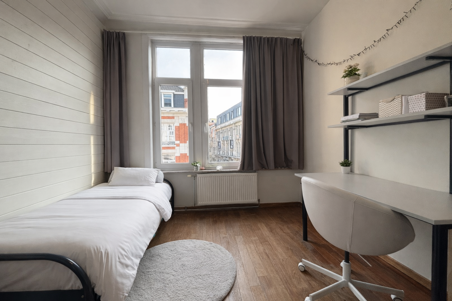 De gerenoveerde residentie biedt verschillende formules: je kan kiezen voor een studentenkamer met eigen sanitair (privé douche/toilet) of een studio voor extra privacy.